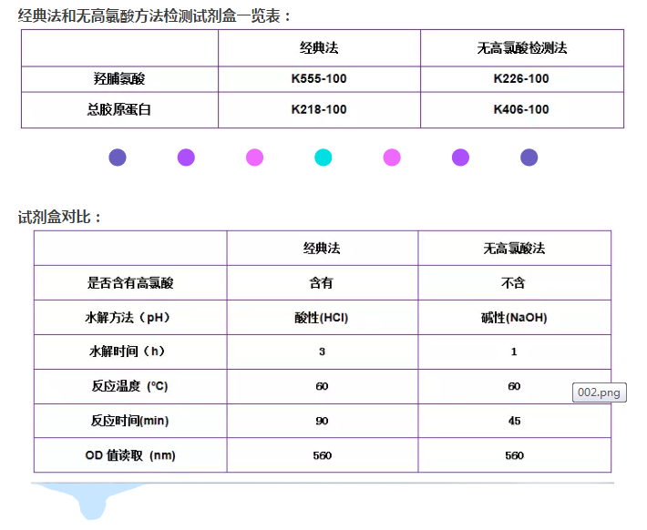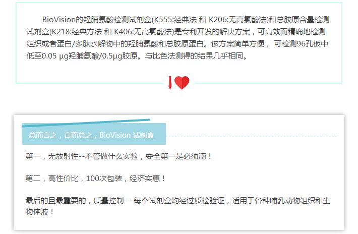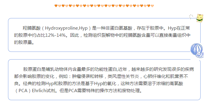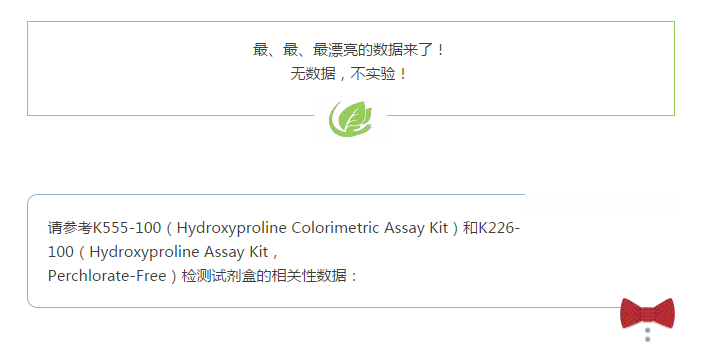 Figure (A). 經(jīng)典高氯酸法檢測的試劑盒(k555-100)和無高氯酸法檢測試劑盒(k266-100)的標(biāo)準(zhǔn)曲線之間的相關(guān)性比較。數(shù)據(jù)顯示此兩種檢測方法具有非常好的相關(guān)性(R2 > 0.999)。 (B). K266-100試劑盒檢測大鼠樣本中的總羥脯氨酸的含量。