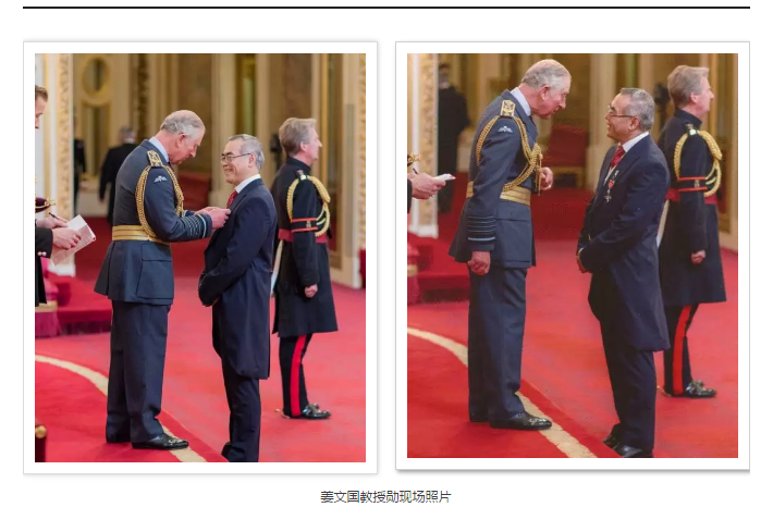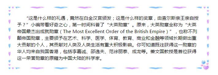 2017年3月16日,英國卡迪夫大學(xué)的華人科學(xué)家姜文國教授在倫敦白金漢宮接受了英國王儲查爾斯親王親自授予的2017年度“大英勛章”,表彰其在“國際癌癥研究方面的突出貢獻(xiàn)”, 成為首位獲得這一榮譽(yù)勛章的原籍為中國大陸的科學(xué)家。