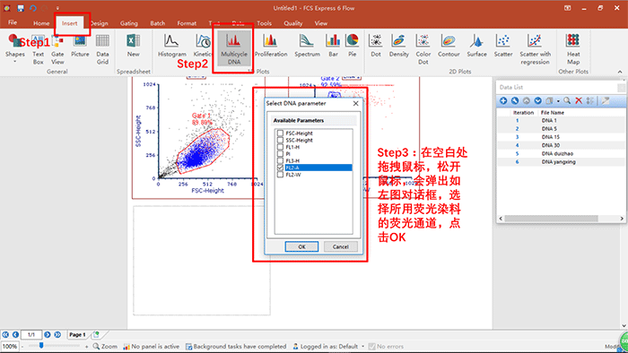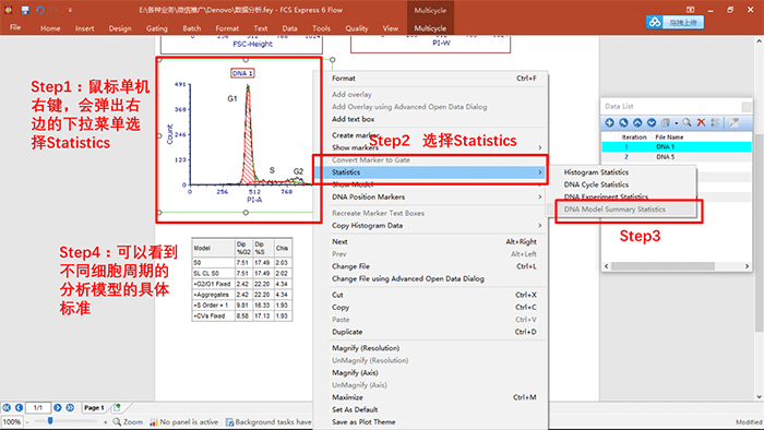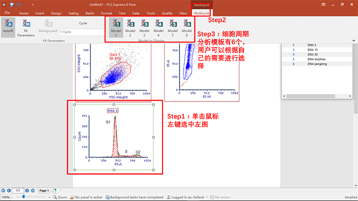a.粘連細(xì)胞去除之后,可直接調(diào)用Denovo自帶的細(xì)胞周期分析模板,完成數(shù)據(jù)分析,具體操作如下: