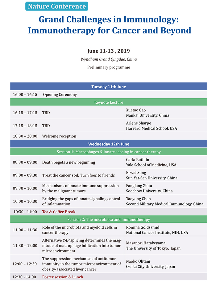 此會議是以《Nature Immunology》、《Nature Review Immunology》、《Nature》和《Cellular &Molecular Immunology》四本國際頂級免疫學(xué)期刊為交流平臺,以促進國際免疫學(xué)家交流為主旨的學(xué)術(shù)會議,自2009年起本系列會議啟動召開,現(xiàn)已成功舉辦六屆會議。