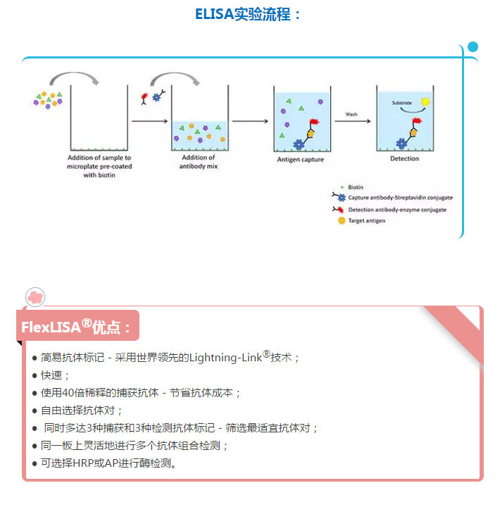 Innova Biosciences FlexLISA?主要是用于開(kāi)發(fā)和優(yōu)化雙抗體夾心ELISA,將抗體對(duì)分別與Streptavidin和HRP/AP標(biāo)記,然后將樣本和標(biāo)記抗體對(duì)分別加入預(yù)包被Biotin 96孔板,室溫孵育1小時(shí),清洗后加入酶檢測(cè)試劑即可實(shí)現(xiàn)檢測(cè)。