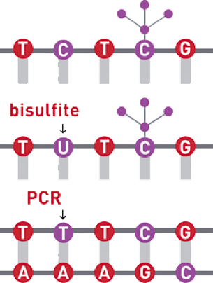 重亞硫酸鹽轉化是研究DNA甲基化的金標方法。該技術基于非甲基化胞嘧啶(C)向尿嘧啶(U)的化學轉化,即用重亞硫酸鹽處理基因組DNA,非甲基化胞嘧啶被轉化為尿嘧啶,而甲基化胞嘧啶不發(fā)生這種轉化,從而能夠在單核苷酸水平上確定DNA甲基化(圖1)。轉化后的序列可以進行多種分析,包括重亞硫酸鹽測序、焦磷酸測序、甲基化特異性PCR、高分辨率熔解曲線分析、基于微陣列的方法和下一代測序。