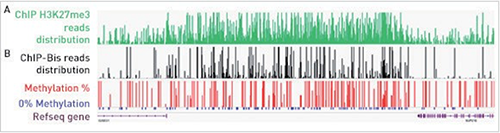 圖3 A: 使用Diagenode的iDeal ChIP-seq Kit對人細胞系Gm12878 H3K27me3標記的組蛋白進行染色質免疫沉淀;B: 使用Premium WGBS Kit對ChIP’d DNA進一步處理并測序。