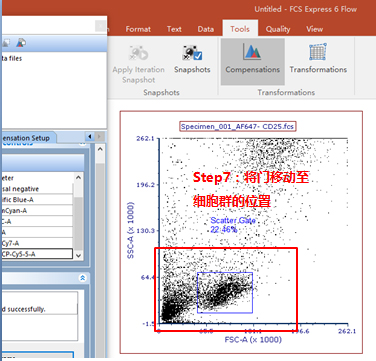 此時(shí)可以手動(dòng)調(diào)節(jié)兩通道之間的補(bǔ)償,該數(shù)據(jù)為FITC單管,可用PE-FITC調(diào)節(jié)FITC滲漏到PE通道去的熒光。步驟如下圖所示: