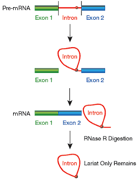 隨著環(huán)狀RNA的深入研究,環(huán)狀RNA制備問題就越來越備受關(guān)注。Lucigen提供大腸桿菌來源的RNase R,是一種Mg依賴性的3’ →5’核糖核酸外切酶,能消化基本上所有線性RNA,但不消化套索或環(huán)狀RNA的結(jié)構(gòu),或者3’突出短于7個核苷酸的雙鏈RNA。即是除了tRNA,5S RNA和內(nèi)含子套索結(jié)構(gòu)外,大多數(shù)細胞RNA都將被RNase R完全消化。如圖4,RNase R可從總RNA中分離出內(nèi)含子前體mRNA剪切產(chǎn)生的套索RNA。以這種方法獲得的RNA作為模板來生產(chǎn)標記的cDNA,可作為含有潛在的內(nèi)含子序列的微陣列的目標,或者用于包含完整的染色體或者基因組的重疊區(qū)域平鋪陣列。產(chǎn)生的cDNA不代表線性內(nèi)含子,但其含有的序列是來源于內(nèi)含子的。