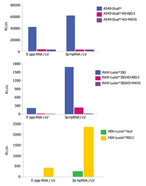 ISG對RIG-I配體的反應:使用300 ng/ml的5’ppp-dsRNA或30 ng/ml的3p-hpRNA刺激衍生自A549的細胞;使用1 μg/ml 5’ppp-dsRNA或3p-hpRNA刺激衍生自RAW和HEK293的細胞。經(jīng)過孵育過夜,可使用QUANTI-Luc?檢測上清中Lucia熒光素酶活性的相對光單位(RLUs)以測試ISG的反應。