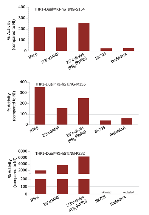 功能獲得(Gain-of-function)的活化-THP1-Dual? KI-hSTING-S154細胞和THP1-Dual? KI-hSTING-M155細胞均均可以持續(xù)活化ISG,而THP-1-Dual? KI-hSTING-R232卻不能。加入IFN-β或STING激動劑將進一步促進ISG的活化。注意,結(jié)果已被非刺激細胞背景信號標準化。因為其持續(xù)活化STING的特性,SAVI細胞的背景非常高,誘導ISG應答的增加倍數(shù)低于R232對照細胞。