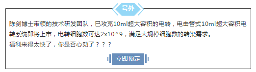 Amaxa技術(shù)只有100ul和更小的20ul體系。100ul體系一次電轉(zhuǎn)也就是10^6級,這和脂質(zhì)體/病毒轉(zhuǎn)染可適應(yīng)10^6-10^9不可同日而語。這也是很多人為什么不選擇電轉(zhuǎn)路徑的重要原因之一。由于Amaxa已經(jīng)選擇了狹縫U型電擊杯的路線,這導(dǎo)致其無法加大細(xì)胞轉(zhuǎn)染量這一難題。近兩年Amaxa/Lonza公司推出了可一次做10^7-10^8轉(zhuǎn)染的新機(jī)器,但是基本原理依然基于100ul電轉(zhuǎn)反應(yīng)體系,無非是采用了復(fù)雜的流體系統(tǒng),通過多次自動連續(xù)進(jìn)樣,從而把一個本來一次可以完成的1ml或者10ml轉(zhuǎn)染分成了連續(xù)的10次或者100次轉(zhuǎn)染而已。可以看到這種錯誤技術(shù)路線導(dǎo)致這種解決方案的機(jī)器構(gòu)造復(fù)雜而價格昂貴,而耗材成本更是天價:一兩萬人民幣耗材做一個108細(xì)胞的轉(zhuǎn)染,你能接受嗎?