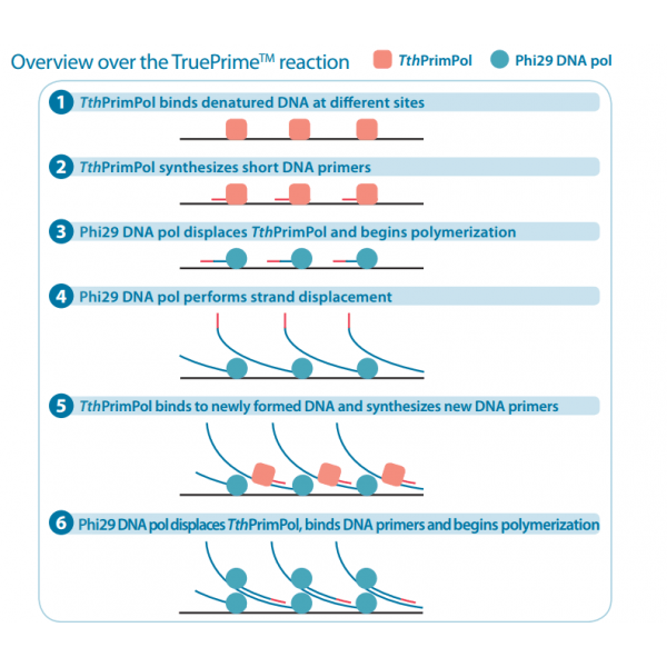 TruePrime?采用MDA技術,基于新型的TthPrimPol 引物酶和Phi29 DNA聚合酶,擴增過程無需添加隨機引物,減少了擴增偏倚,提高了擴增過程的覆蓋率和保真性,并且對于污染的外源DNA不敏感,可重復性好。TruePrime?可用于單個細胞或少量細胞的全基因組擴增,與常見的NGS平臺如Illumina和IonTorrent等兼容性良好。