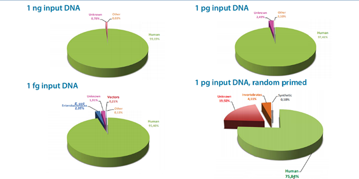 結果表明僅使用1fg 的樣本即可以擴增出95%以上的人體基因組片段;而使用隨機引物擴增的結果中,約有20%不匹配任何生物體的非特異性序列(右下圖)。