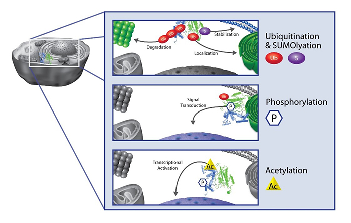 盡管目前已知的PTM的種類超過400種,但只有少數(shù)幾個被詳細研究過,主要包括甲基化、磷酸化、乙?;⒎核鼗?/span>SUMO化,它們被證明是幾乎所有細胞的關鍵調節(jié)因素,包括信號轉導、表觀遺傳學、基因和蛋白質表達、蛋白質穩(wěn)定性和定位以及細胞免疫。