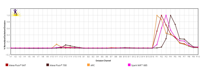 由于近紅外(NIR)范圍內(nèi)的熒光發(fā)射光譜以及光電倍增管(PMT)對800nm以上發(fā)射波長的不敏感性,633nm紅色激光器僅限于2-3個熒光。借助全光譜流式細胞儀,APC和AlexaFluor?700的發(fā)射峰之間的光譜間隙可檢測Spark NIR?685等新型熒光。Spark NIR?685可被633 nm激發(fā),最大發(fā)射波長為685 nm,與FITC具有相似的亮度。