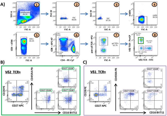 分析泛γδT細胞中的Vδ1+T細胞和Vδ2+T細胞 2個亞群的比例,以及Vδ1-Vδ2-T雙陰性細胞的比例;