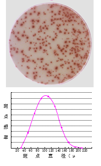 如果一次實(shí)驗(yàn)中有兩類(lèi)細(xì)胞同時(shí)受到刺激,比如T細(xì)胞與巨噬細(xì)胞,或者一次實(shí)驗(yàn)中T細(xì)胞受到兩種不同的刺激物刺激,比如蛋白抗原與內(nèi)毒素(大腸桿菌表達(dá)的蛋白很可能含有較高濃度的內(nèi)毒素),那么同一個(gè)孔中就會(huì)出現(xiàn)兩種不同的斑點(diǎn)。這兩種斑點(diǎn)用肉眼很難區(qū)別,但是如果對(duì)它們直徑分布做統(tǒng)計(jì)作圖的話,就會(huì)有別于圖1.3中的單峰分布,而是呈現(xiàn)雙峰分布。
