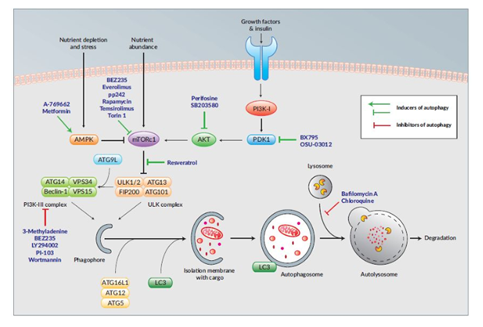 自噬是原生分解程序,由細胞內應激物(營養(yǎng)物和能量貧乏)引起。自噬由生成自噬體開始,這一步驟由一系列蛋白調控,包括VPS34的Ⅲ型磷脂?;迹?/span>PI)3激酶復合體,隨后與溶酶體的融合將自噬體酸化。自噬的阻斷有多種形式,例如Ⅲ型PI3激酶抑制劑可通過抑制自噬捕獲動作而阻斷自噬進程,或者用抑制溶酶體酸化的抑制劑阻止自噬溶酶體的形成和自噬降解。自噬進程是被縝密調控的。mTORC1,一種對營養(yǎng)物和生長因子敏感的激酶,是自噬的主要阻遏器。因此,mTORC1及其信號通路的抑制劑可誘導產(chǎn)生自噬。